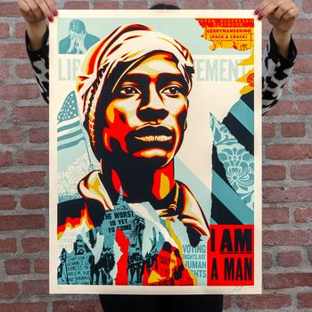 Voting Rights Are Human Rights. 18 x 24 inches. Screen print on Cream Speckle Tone paper. Original photo by Steve Schapiro. Signed by Shepard Fairey. Numbered edition of 550. $65. Proceeds go to Equal Justice Initiative. Available on February 25th @ 10AM PDT at https://store.obeygiant.com/collections/prints. Max order: 1 per customer/household. *Orders are not guaranteed as demand is high and inventory is limited.* Multiple orders will be refunded. International customers are responsible for import fees due upon delivery. ALL SALES FINAL.