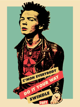 Image of Sid Vicious, who played a large role in Shepard Fairey's life. For more information about Vicious' band, see Sex Pistols. A cropped variation of the original photograph this print is based on can be viewed here.