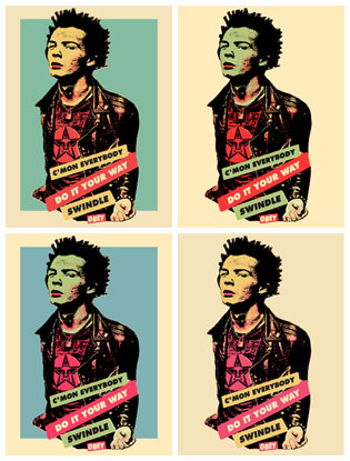 Image of Sid Vicious, who played a large role in Shepard Fairey's life. For more information about Vicious' music, see Sex Pistols. A cropped variation of the original photograph this print set was based on can be viewed here.